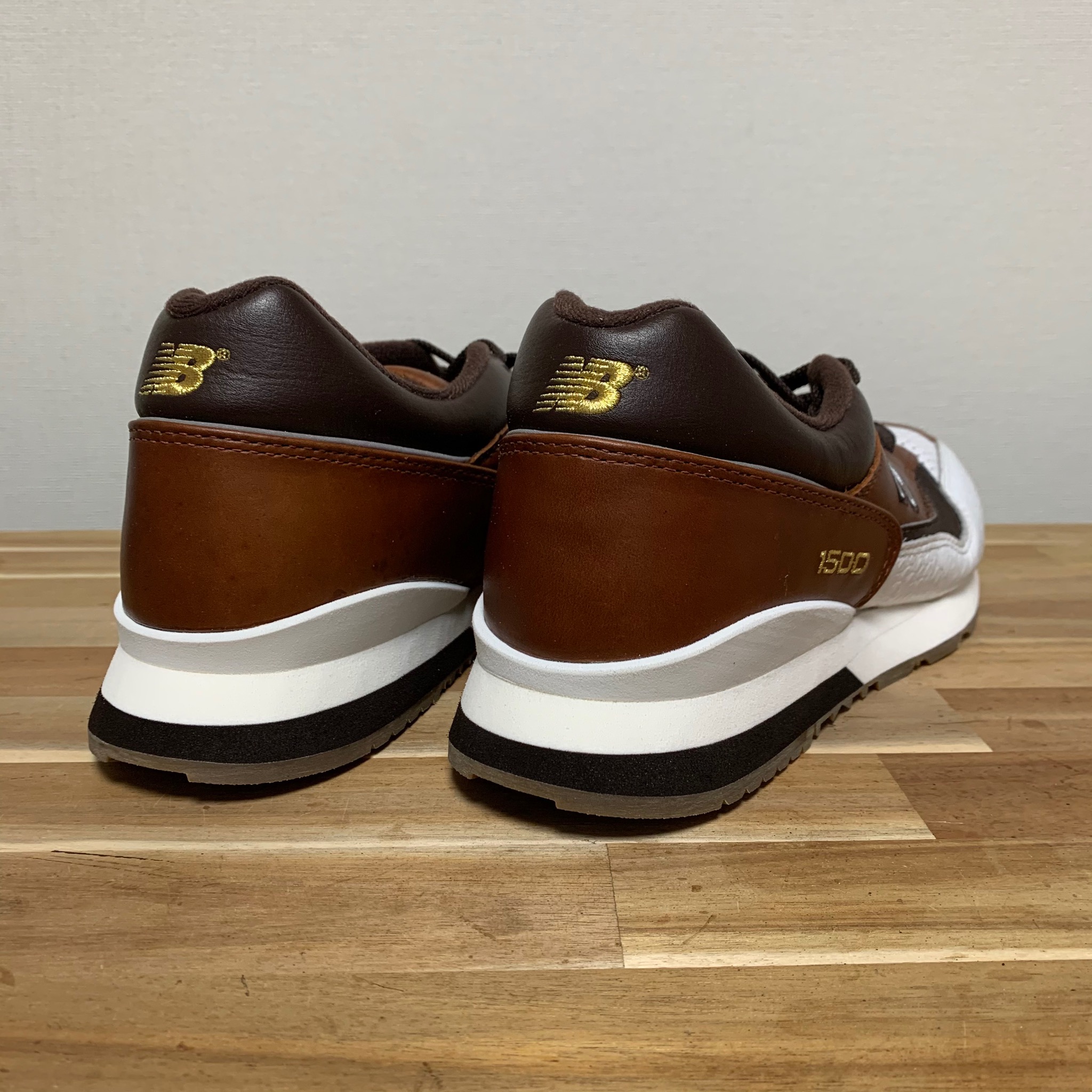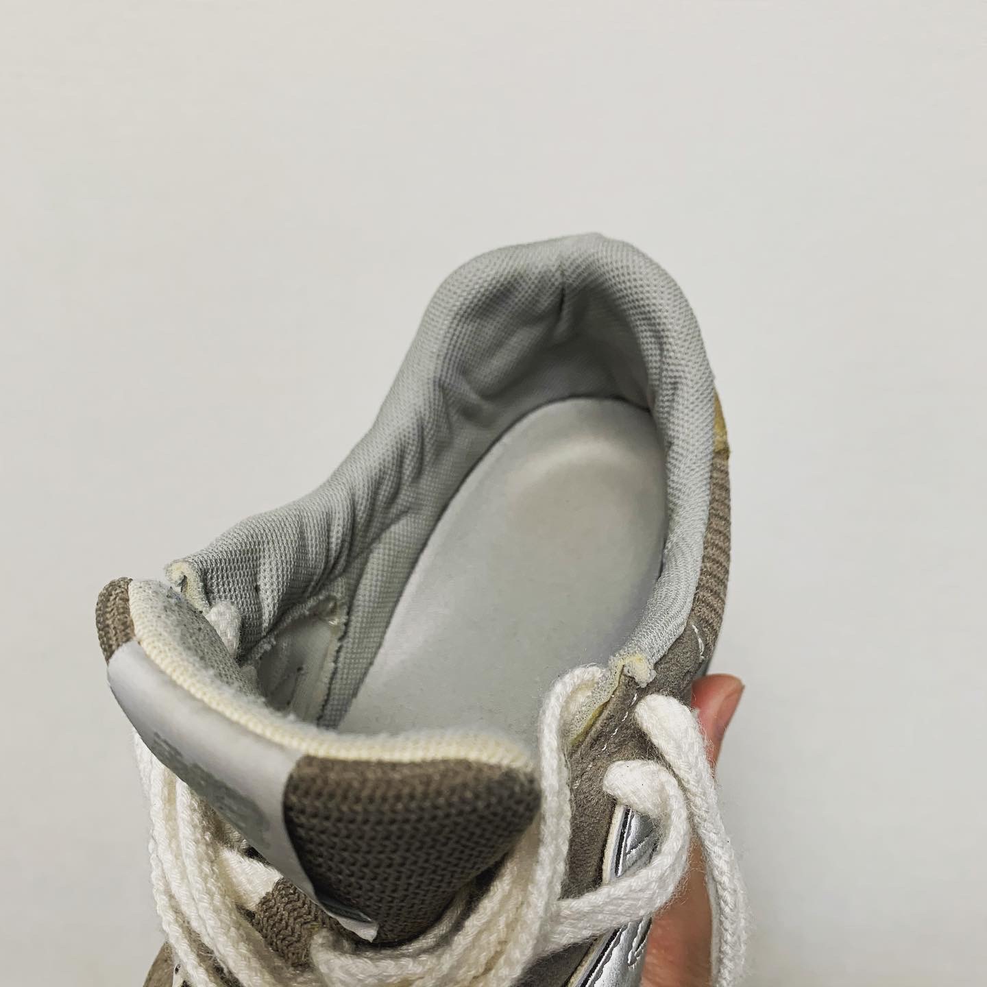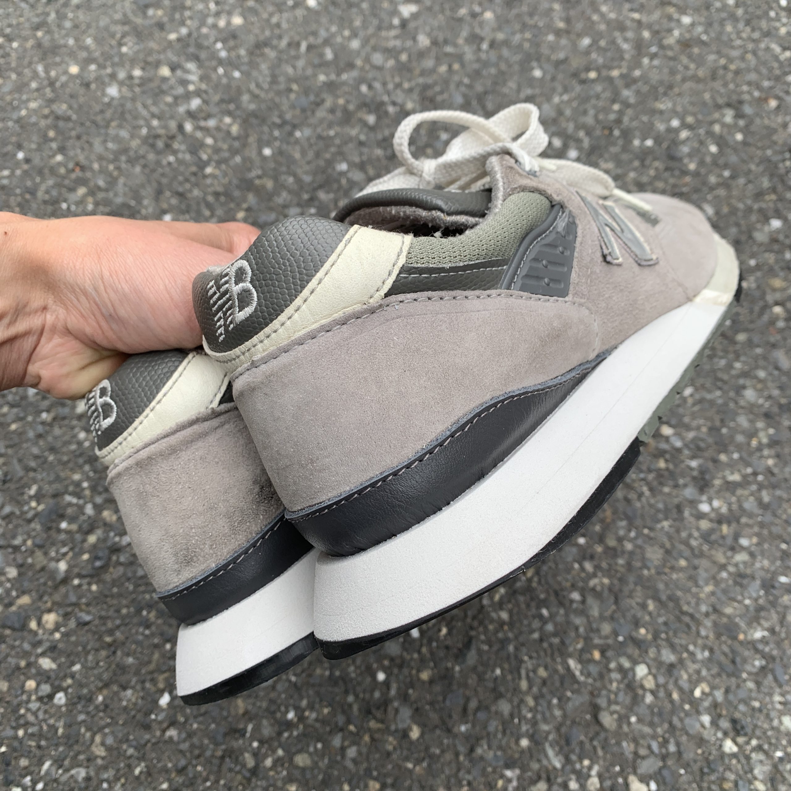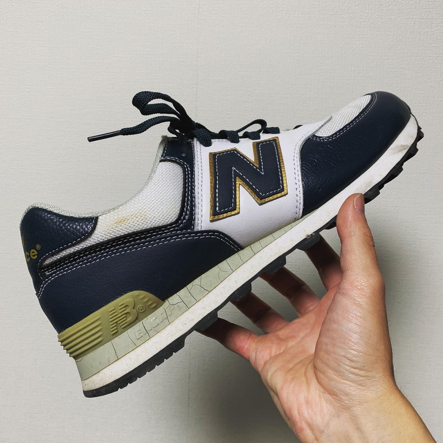 NB1400はミッドソール内部にウレタン素材が内蔵されており、まわりはスポンジ素材で囲われています。画像のようにカカトの側面にウレタンが一部見えるようになっており、加水分解が起きるとウレタンがボロボロになって出てくることがあります。また、内部で加水分解が起きている場合は見た目ではわかりにくいですが、アウトソールの中心部分を指で押してみるとベコベコとした感触があります。