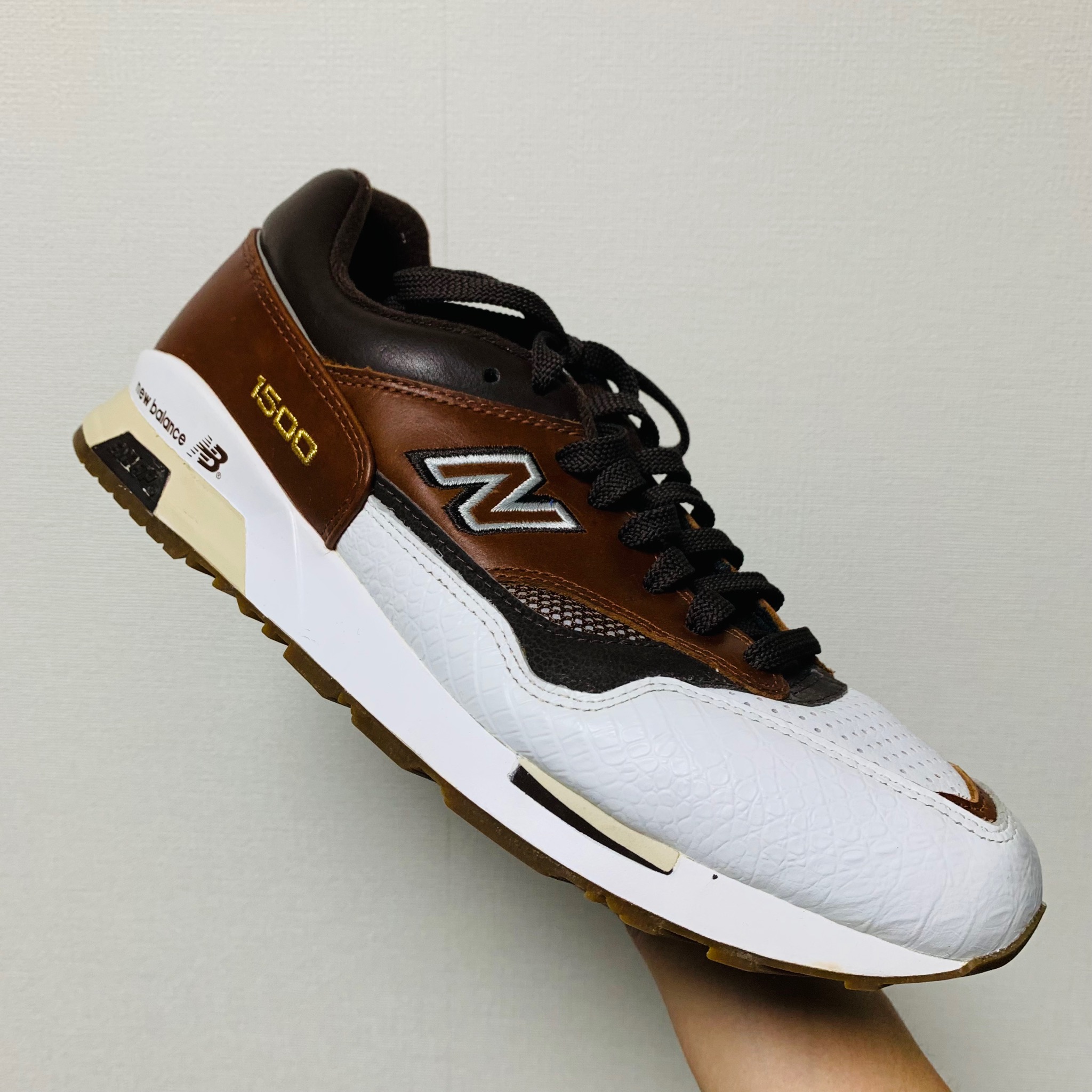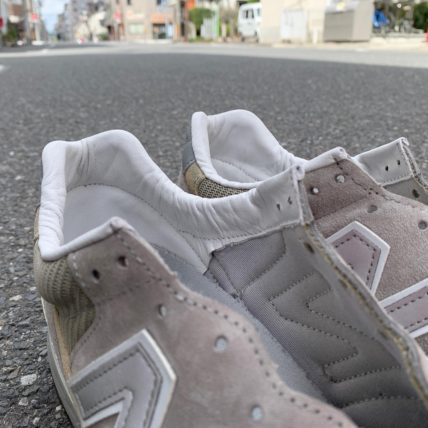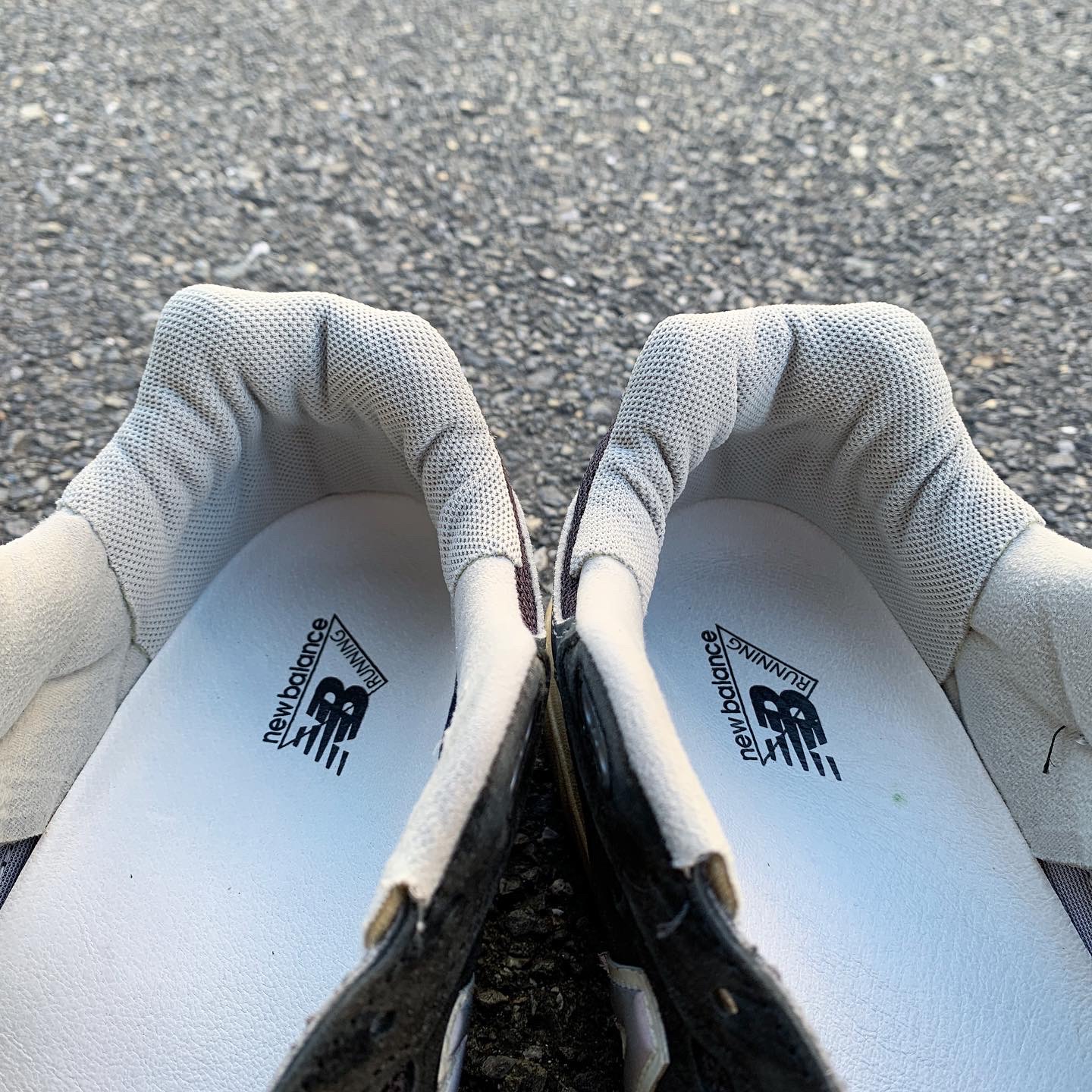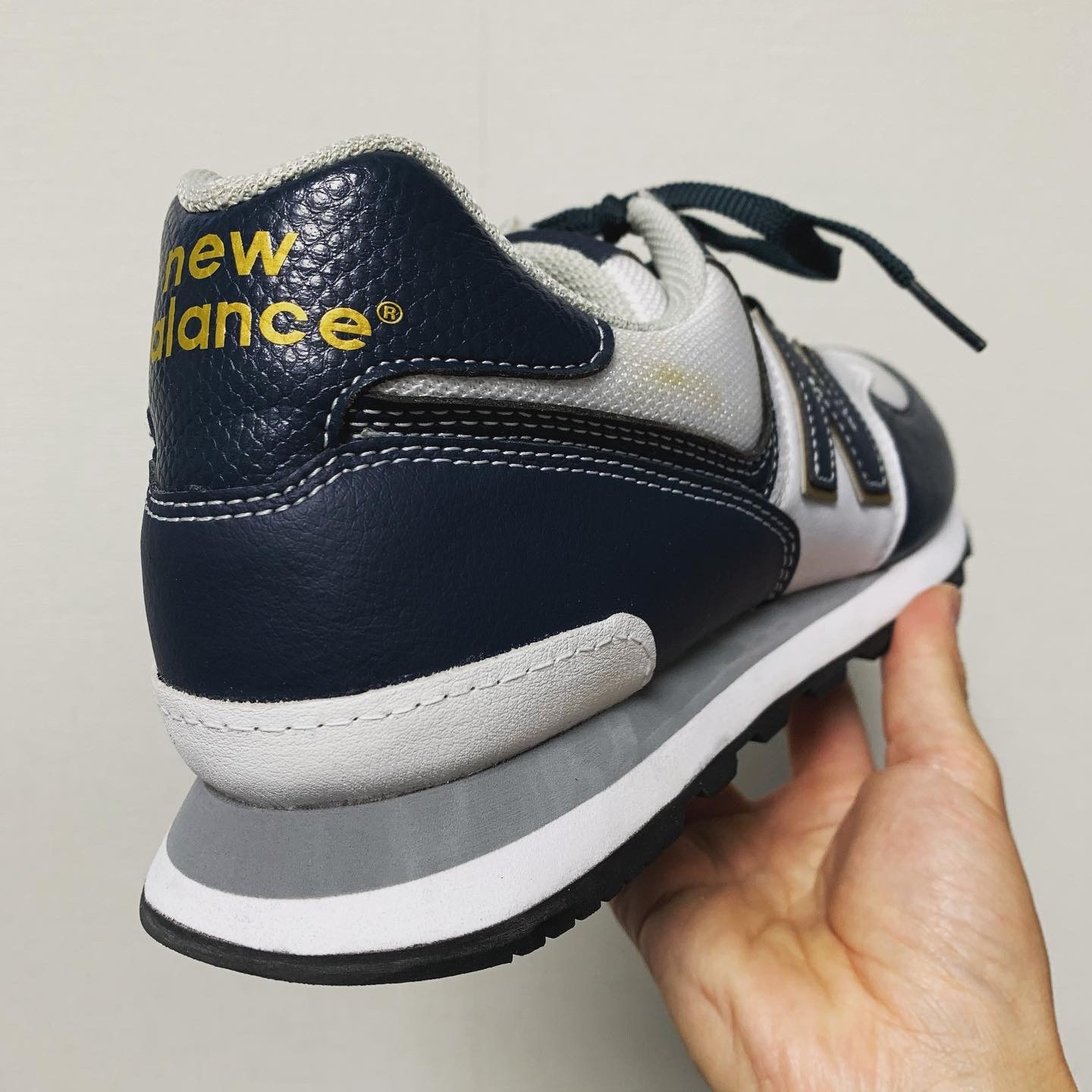 NB1400はミッドソール内部にウレタン素材が内蔵されており、まわりはスポンジ素材で囲われています。画像のようにカカトの側面にウレタンが一部見えるようになっており、加水分解が起きるとウレタンがボロボロになって出てくることがあります。また、内部で加水分解が起きている場合は見た目ではわかりにくいですが、アウトソールの中心部分を指で押してみるとベコベコとした感触があります。