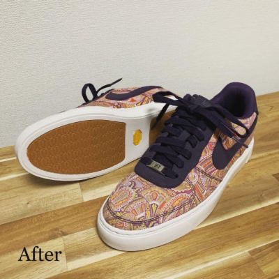 ナイキのエアフォース1やエアジョーダン1、アディダスのスタンスミス、コンバースのオールスターなどに対応できるオールソール交換です。側面にカバーを巻くことで元のソールのあった痕を隠すことができます。