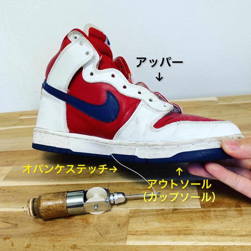 アウトソールの中でも、アッパーをはめ込むことができるようにカップ形状になっているソールのことを呼びます。画像のようにオパンケステッチを縫い付けているモデルや、カップソールにはめ込んで接着されているだけのモデルもあります。
