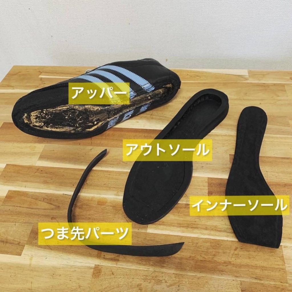 アッパーやソール、ヒールカウンターなど、靴はいろいろなパーツから組み上がっていますが、それぞれに名前が付いています。デザインが多岐に渡っている昨今のスニーカーで一部名称のないパーツもあります。ですが、おそらくほとんどの靴修理屋さんで通じるであろう各パーツの名称を画像と一緒にご紹介いたします!