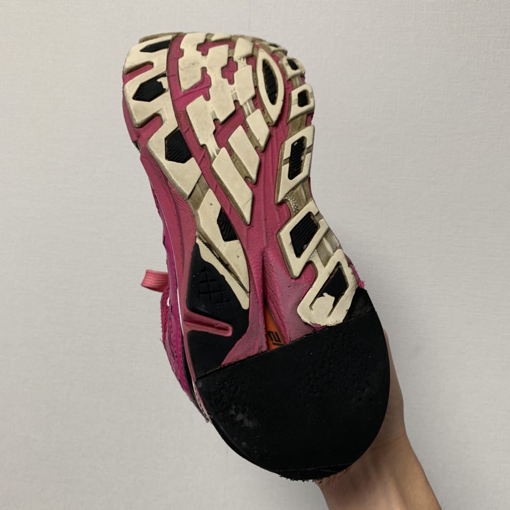カカトは部分的にスポンジの積み上げとラバー補強での修理歴がありました。元のアウトソールの白いラバーに硬化が出始めていたため、アウトソールの全面張り替えをしました。カカトに積み上げられたスポンジもすべて新しいスポンジに交換をしています。ここで大切なことは、ピンク色のミッドソールと近い硬さのスポンジを使うこと、両足のソールの厚みを揃えること、の2点です。元の履き心地から変えないこと、左右のバランスを崩さないこと、は修理後の履き心地を左右する大きな要因ですね!