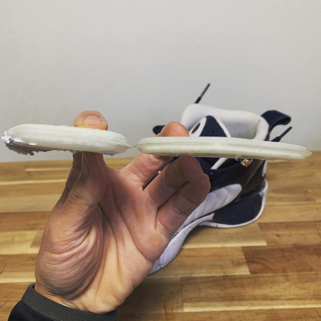 バスケットボール用としてお履きになるご予定で、ミッドソールの指の付け根に内蔵されたエアパックをお持ち込みいただいた別のエアパックに交換をしてから再接着をしています。このエアユニットがパフォーマンスの要となるようです。こういったお話を聞くことができるのもスニーカー修理をしている醍醐味と言えますね。