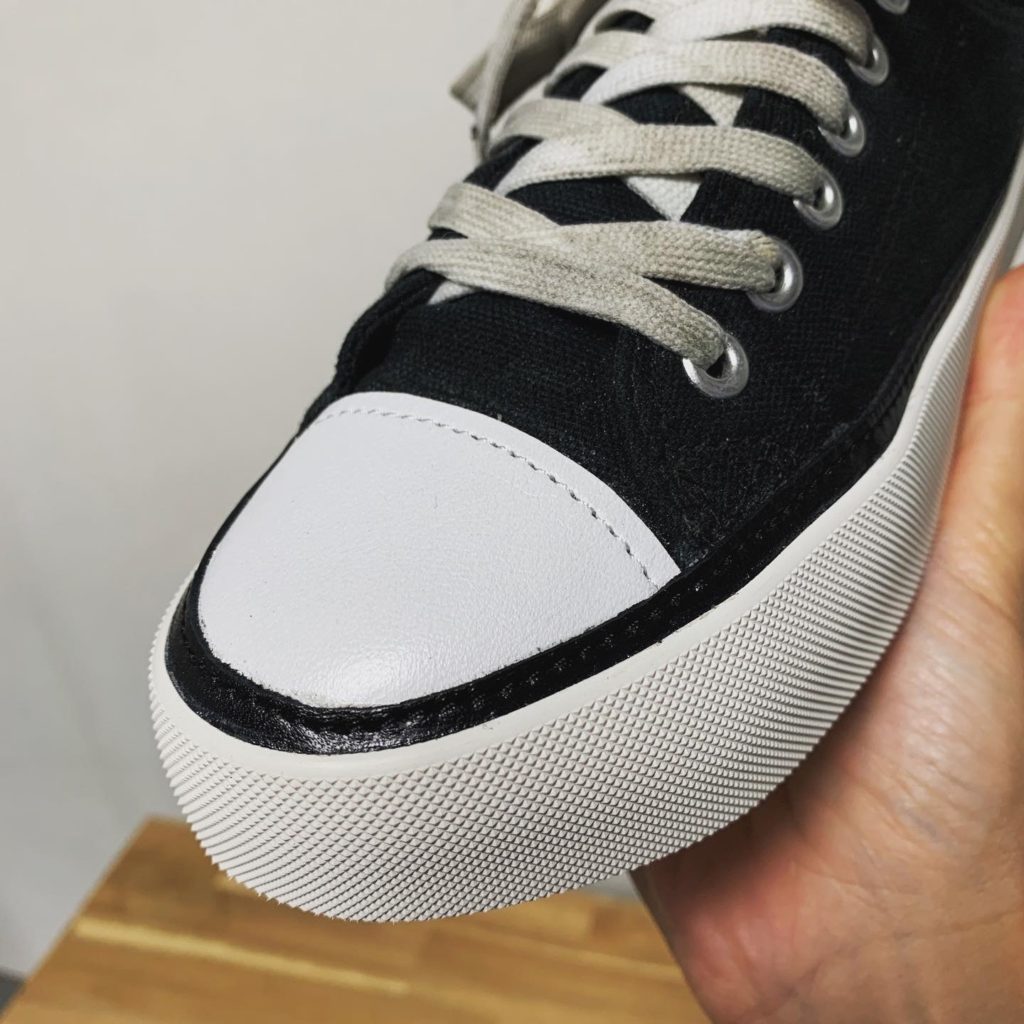つま先部分は黒のスムースレザーで張り替えたのちに、1本ステッチを加えてデザインと剥がれ防止の役割を持たせました。ソールはオリジナルの色配置に合わせて、アウトソールを白、サイドカバーを黒にして作製いたしました。心残りと言えば、アウトソール底面の【CHANEL】のロゴを再現することができないため、オールソール交換をすることでなくなってしまうことですね。