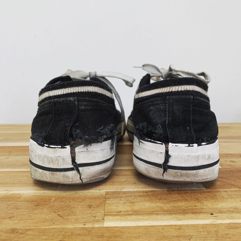 こちらのスニーカーはお客様にとって大切な時期に履いていたシューズのようで、直せるところまで修理をしてほしいとご依頼をいただいた一足です。
