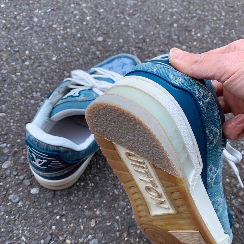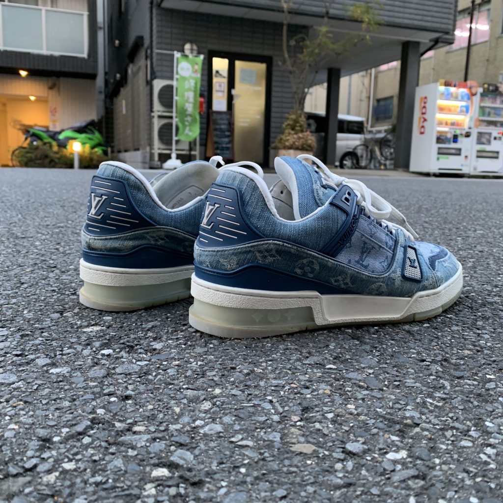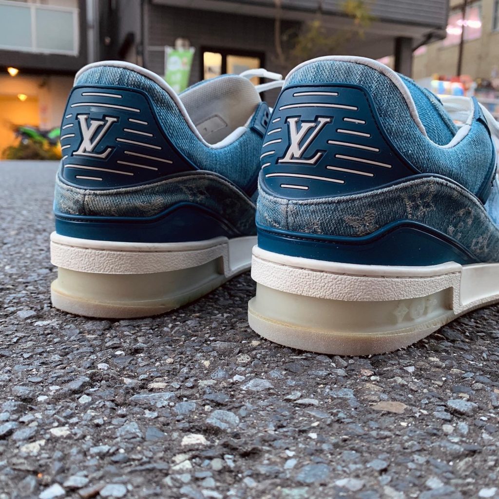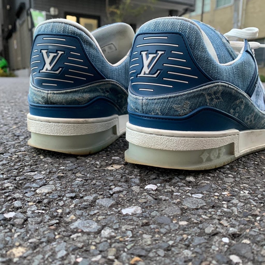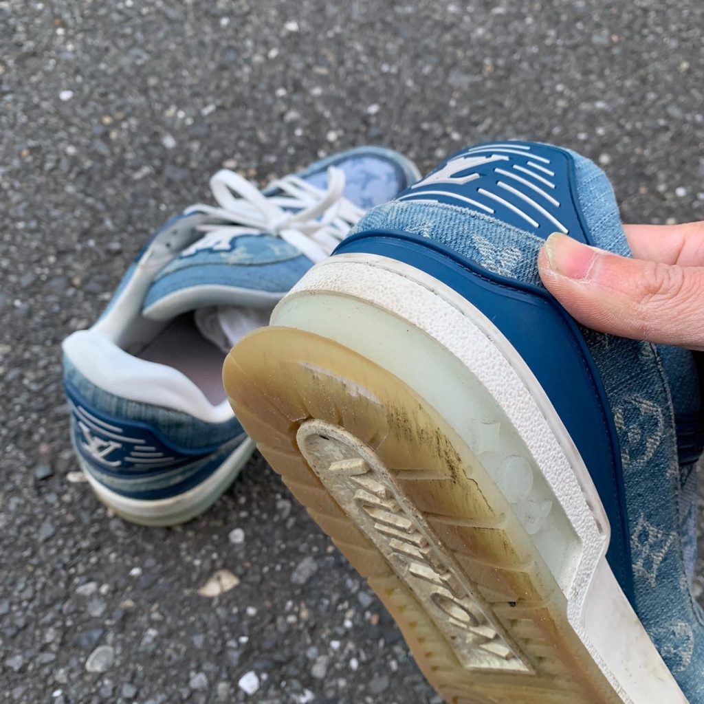 ルイヴィトンのデニムスニーカーのカカト補修です!こちらのモデルはソール底面部分がグレーのややスケルトンタイプとなっていました。底面のみがベージュ色になっているのは経年変化や汚れによるものだと思われます。ゴム素材は側面の色に合わせてグレータイプを使用しました。底面のベージュに合わせることもできます。
