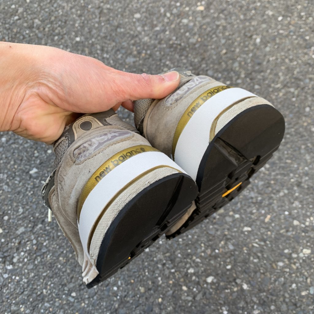 NB993のミッドソールのカカト側にある加水分解したポリウレタン部分をグレー色のEVAスポンジ素材へ交換しました。アウトソールは再利用しています。