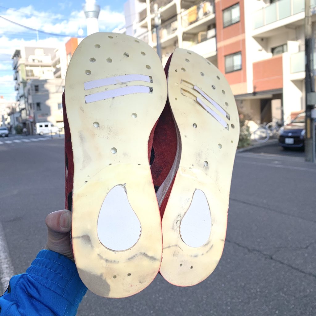 接着剤の劣化による剥がれの場合は、アッパーとソールをそれぞれ引っ張るとさくさく剥がれます。しばらく履かずにしまっておいて数年が経過しているシューズによく見られます。この場合は剥がせるところはすべて剥がしてから再接着をします。