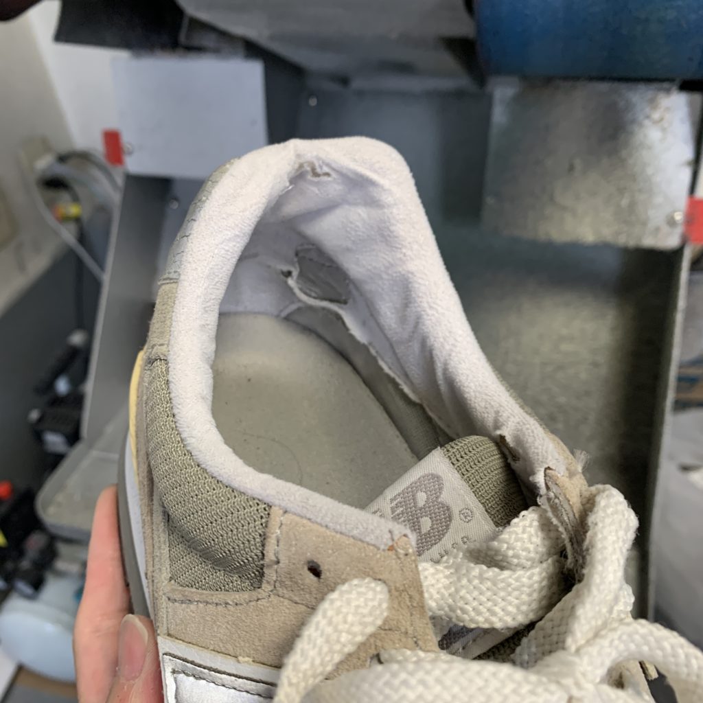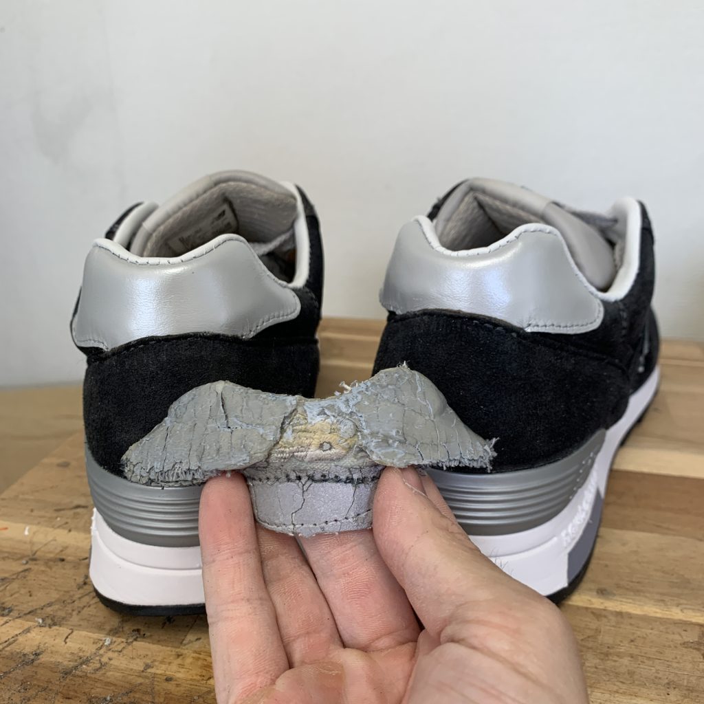 NB576やNB990など、ニューバランスのシューズにはアッパーのカカトにプラスチックパーツがついています。これはヒールスタビライザーという踵のブレを抑える補強材です。こちらのパーツは経年劣化により脆くなって破損してしまいます。表面がベタついてきていると劣化の兆候です。ベタつきが出ていると接着することができません。