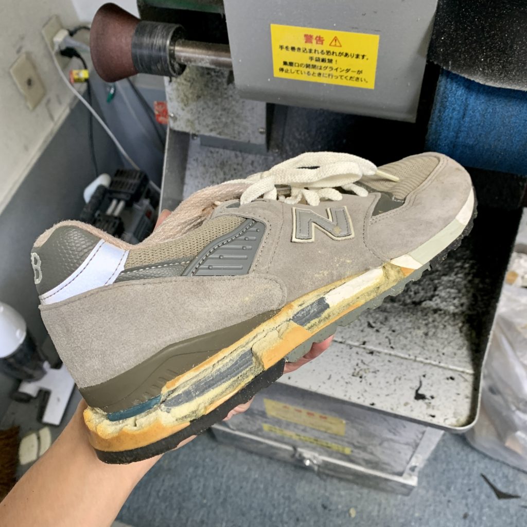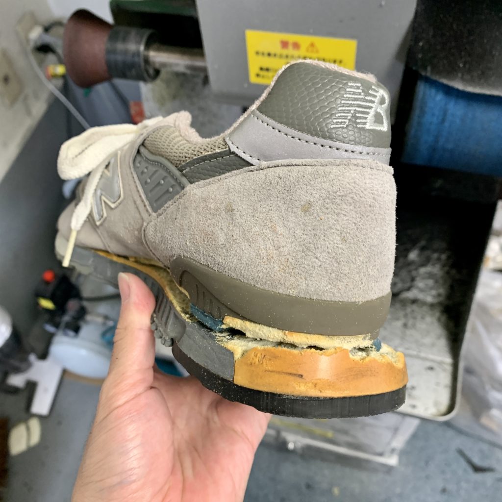NB992はミッドソールのカカト側にポリウレタン素材が使用されています。加水分解したポリウレタン部分だけをEVAスポンジ素材へ交換します。オリジナルのパーツは劣化していなければ再利用をいたします。