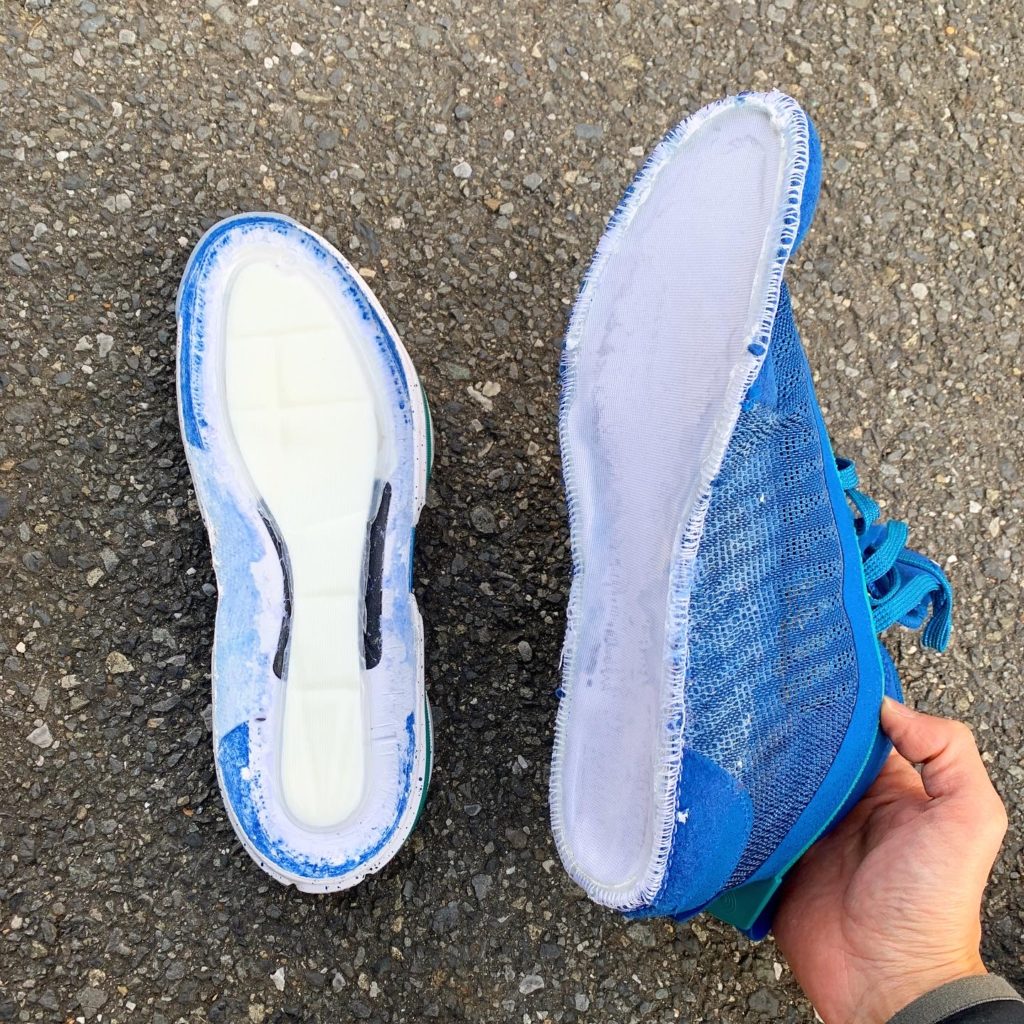 このエアズームストロベルをカットして外し、ジャンプマンプロから取り出したストロベルボードを新たに縫い付け、エアズームストロベル分の厚みをEVAスポンジで埋めました。